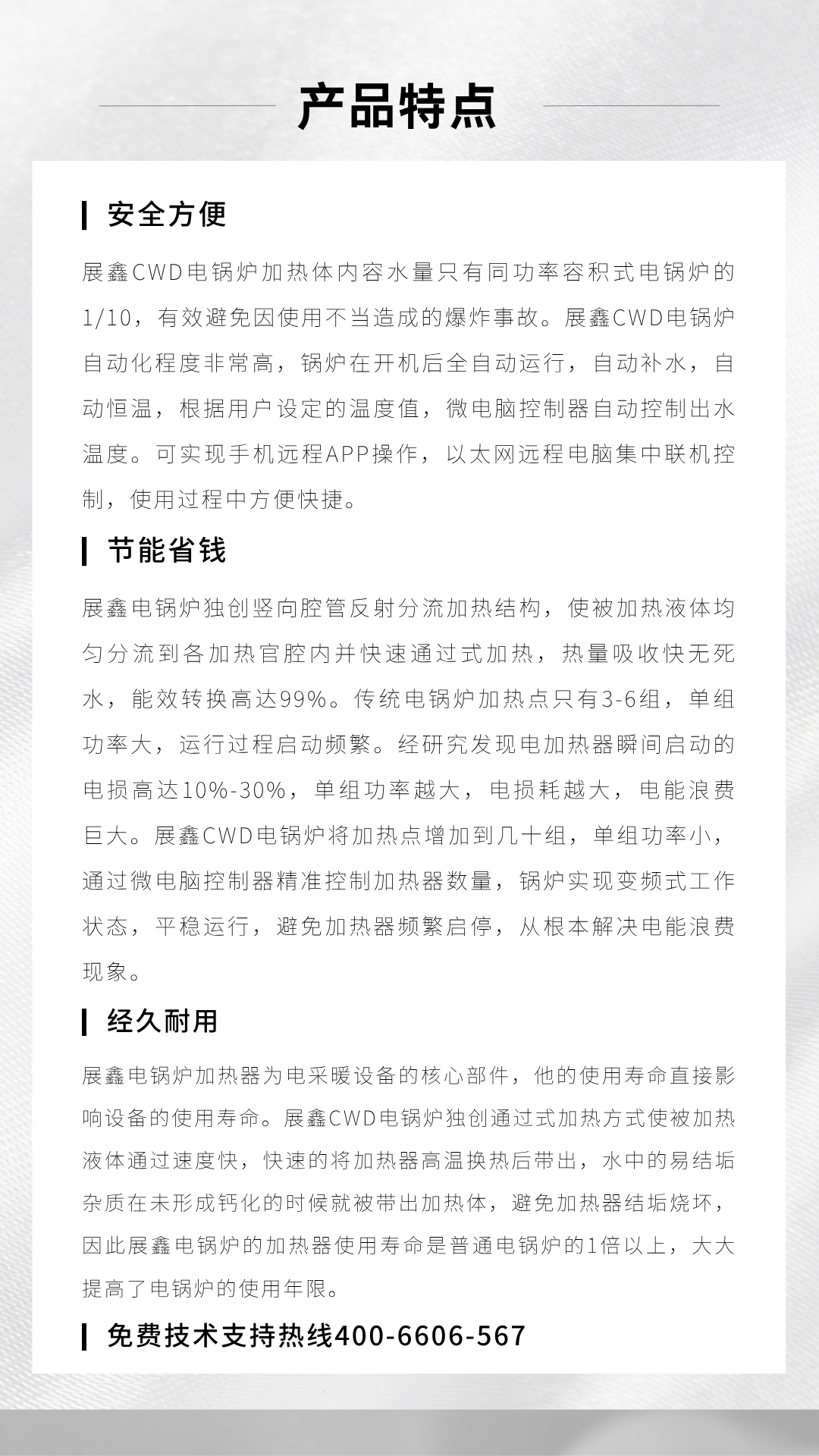 展鑫80KW民用电锅炉用于室内暖气片供暖时可供暖700平米:微电脑控制,根据需要,功率和温度可调,恒定高温供热,暖气片升温速度快。